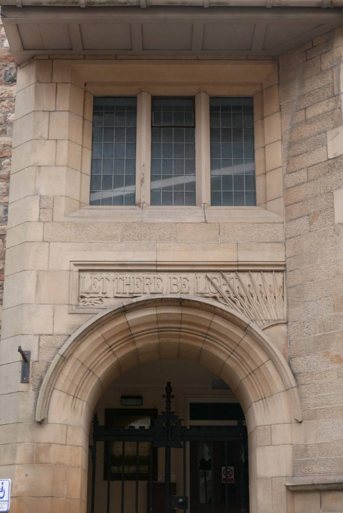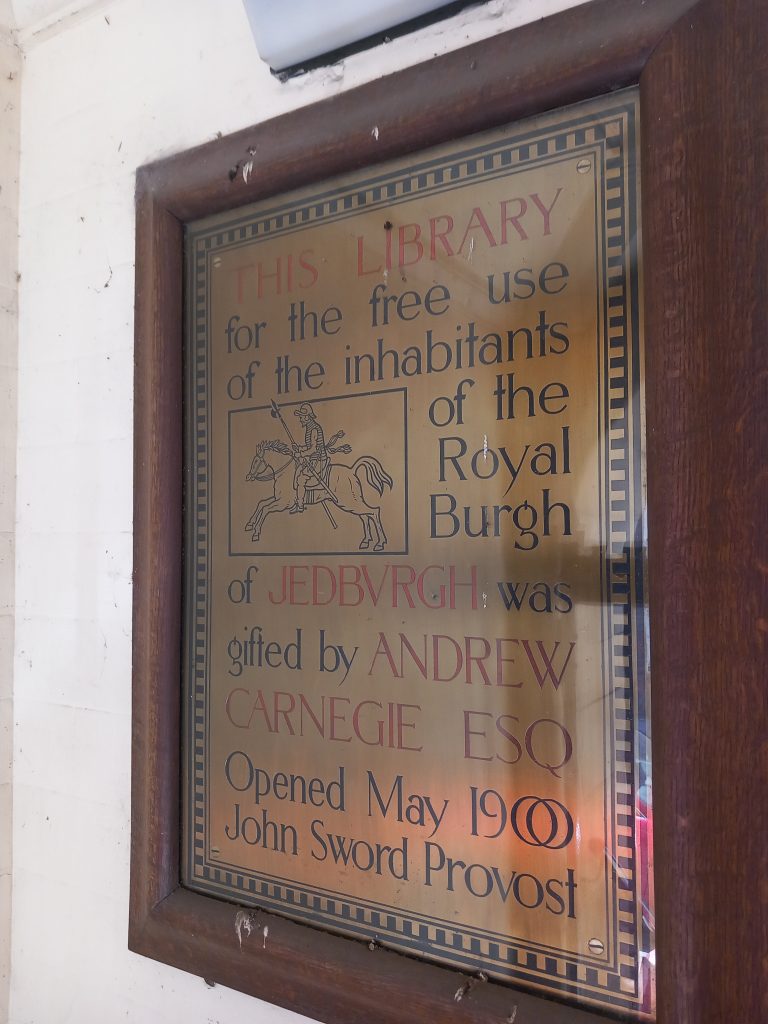 On 4 October 1894 Andrew Carnegie visited Jedburgh and gave a speech about the new library which he had funded in the town’s High Street. This library however proved inadequate and a new library was constructed on Castlegate where the Nag’s Head Inn had stood. The new “Carnegie Library” was fronted by the town’s arms and above the porch was the message “Let There be Light”. The building was designed by Sir George Washington Browne and it formally opened on 24 May 1900 with Andrew Carnegie once more in attendance. It was designed to hold 12,000 books and 59 readers and rooms were set aside above for meetings and a museum. The building in now listed at Category B. (taken from Wikipedia).